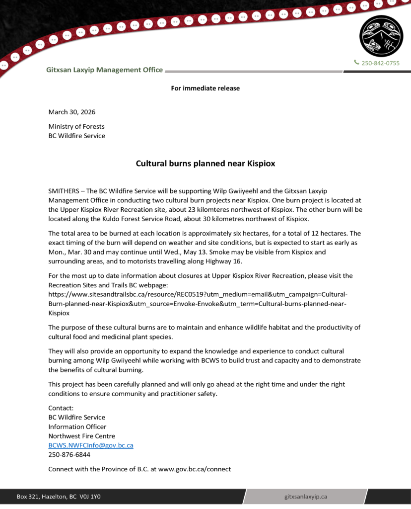 Through consultation and collaboration with Wilp Nikateen and Wilp Gwii Yeehl, cultural burns will be carried out on their Lax Yip in a way that respects traditional knowledge and practices, as well as modern approaches to fire management. It is a forward-thinking method of managing wildfires that combines traditional knowledge with modern science.
