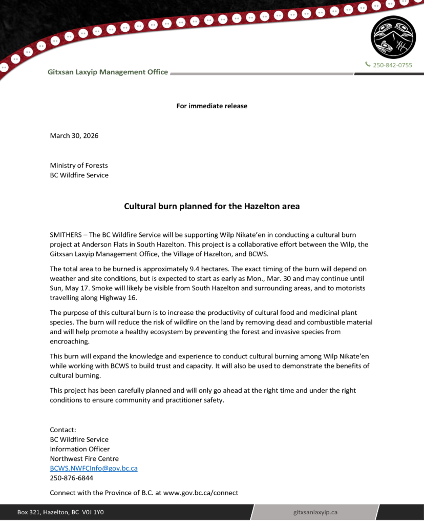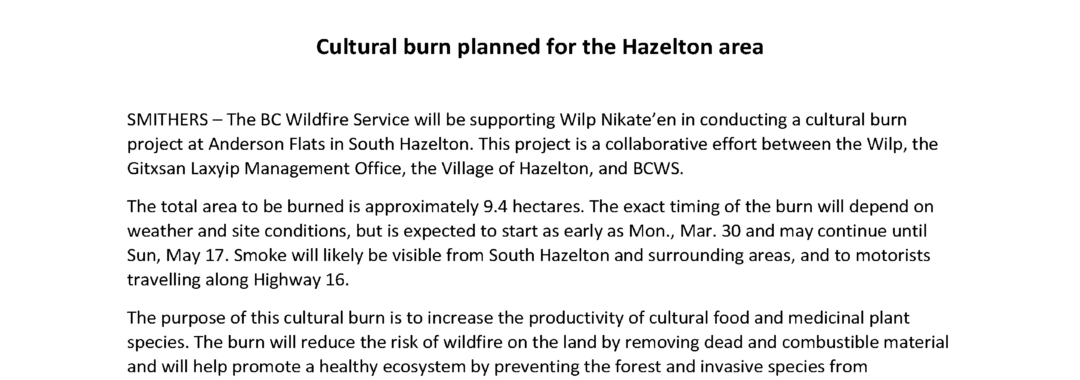 Through consultation and collaboration with Wilp Nikateen and Wilp Gwii Yeehl, cultural burns will be carried out on their Lax Yip in a way that respects traditional knowledge and practices, as well as modern approaches to fire management. It is a forward-thinking method of managing wildfires that combines traditional knowledge with modern science.